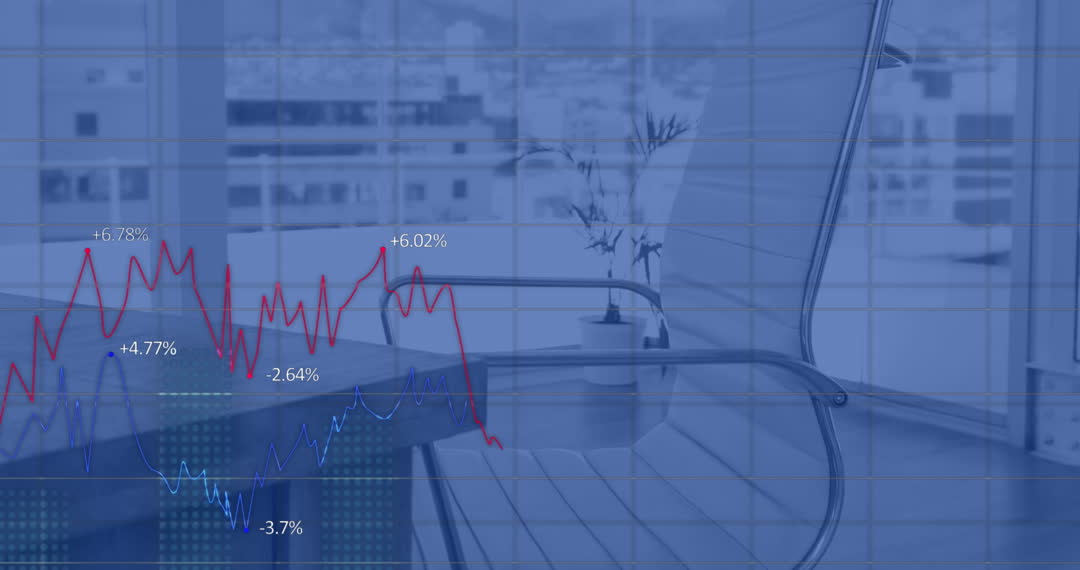 Dynamic visualization of red statistic lines overlays a modern office setting. Represents analytics, financial data analysis, or business growth presentations. Suitable for illustrating financial reports, business strategies, or tech office environments.