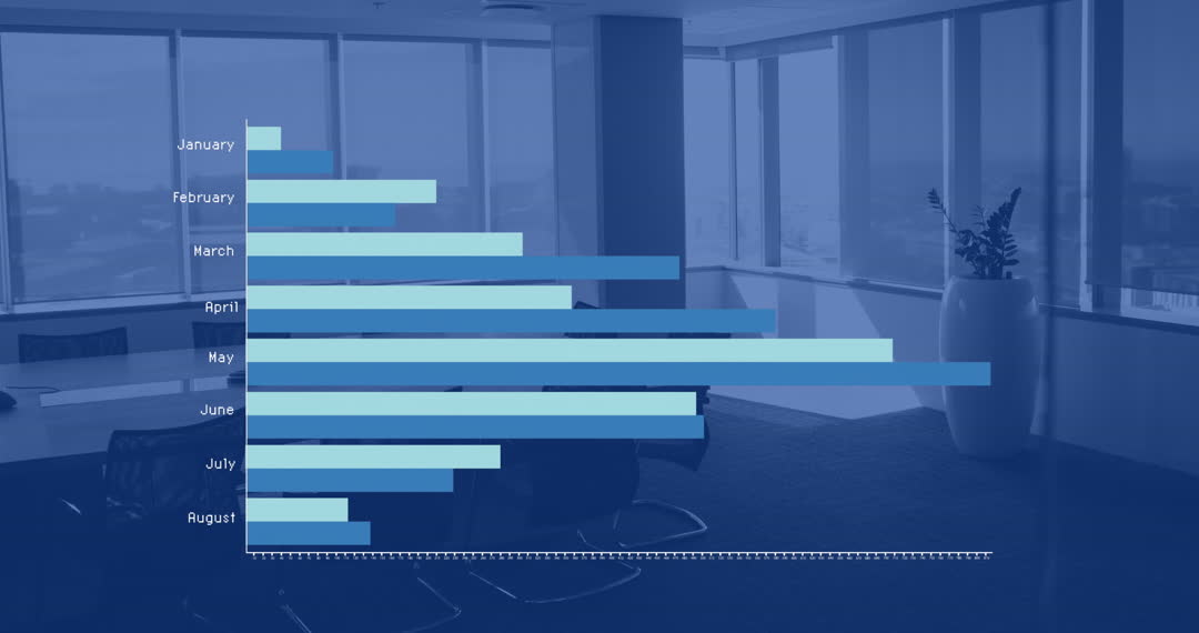 Image shows animated bar chart displaying financial data overlaid on empty modern office space, illustrating concepts of data processing and business analytics. Useful for themes related to finance, corporate analysis, and business intelligence decor with tech-integration design elements in commercials, presentations, websites.