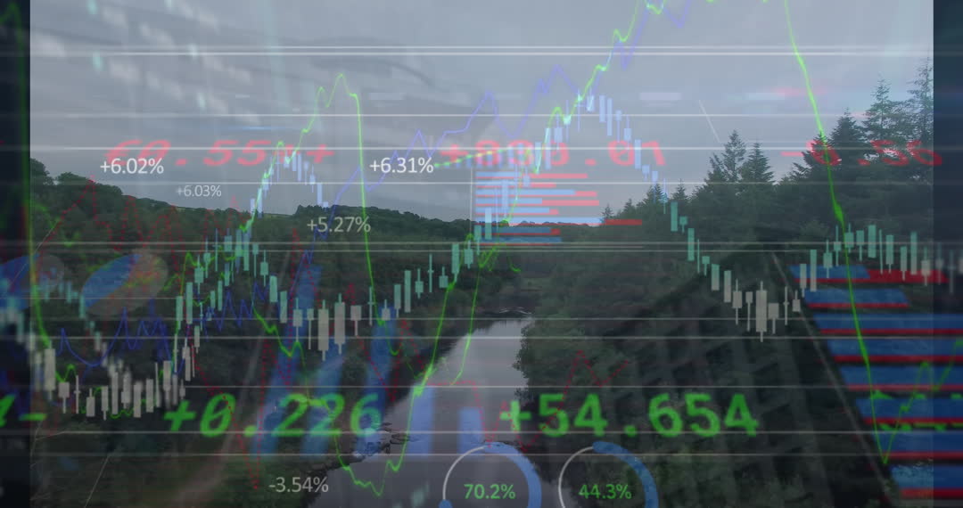 Visual blend showing financial charts and stock market data overlaying a peaceful landscape. Useful for presentations or articles related to global finance, sustainable investment, or financial risks within ecological contexts. Inspires thoughts on the intersection of nature and economics.