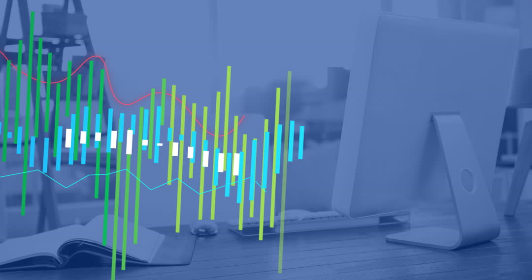 This video showcases a modern office setting featuring digital data visualizations overlaying a desktop computer. The financial data graphs are prominently displayed, making it ideal for themes related to business analytics, financial technology, and data-driven decision-making. Businesses in finance, investment, or technology sectors can utilize this for marketing materials or website content to emphasize their analytical services.