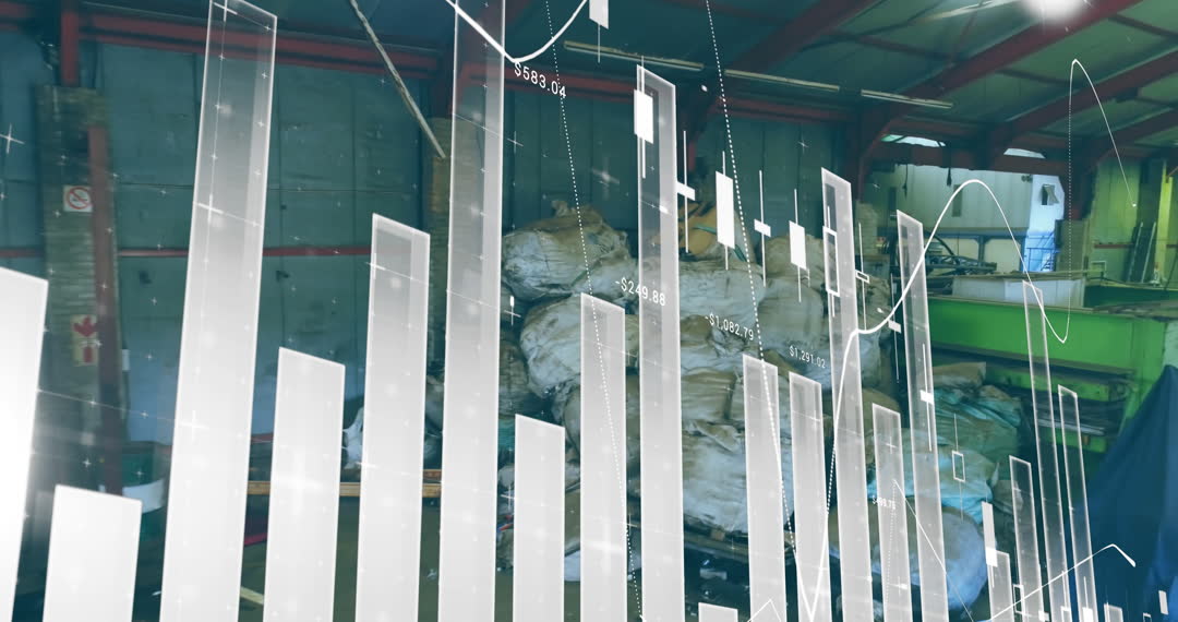 Graphical overlay of financial data on recycling warehouse with bags in background suggests concepts of waste management economics, financial forecasting in recycling industry, or business efficiency in sustainability practices. Useful for presentations, websites, or marketing materials related to environmental finance, sustainable business strategies, or the economics of recycling processes.