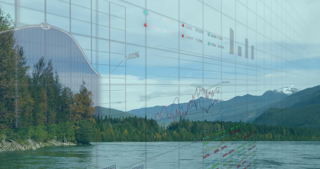 Scene shows animated financial data over majestic natural landscape, representing harmony between business and nature. Use for tutorials, presentations on environmental impact of economics, or projects combining finance with sustainability.