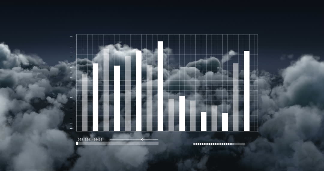 Animation displays financial data depicted as a bar graph set against a background of clouds, symbolizing the merger of data analysis with cloud computing technology. Useful for illustrating concepts related to finance, business analysis, technological integration, or cloud computing strategies. Effective as a visual aid in presentations addressing futuristic tech innovations in global finance or virtual environments in data processing.