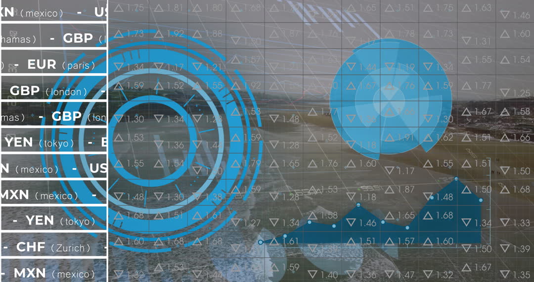 Digital display featuring an animated processing circle overlaid with graphs and financial data. This dynamic visualization represents global business and economic trends within a high-tech environment. Perfect for use in presentations on finance, economics, technology-driven markets, or educational tools for financial analysis and investment strategies.
