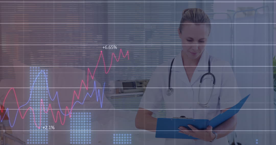 Graph lines and numbers overlay professional attending to suggest intersection of healthcare and finance. Ideal for use in articles about healthcare economics, technology integration in medical fields, data-driven decision-making in healthcare, or healthcare management conferences.