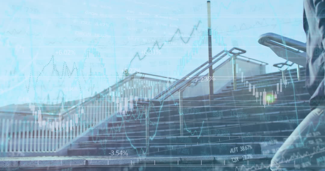 This visual presents an intriguing blend of financial data illustrations with a businessman climbing stairs, symbolizing growth and progress in a business context. This composition suits use in presentations, articles on financial planning, and global business strategies aiming to depict achievement, ambition, and upward mobility in the financial sector.