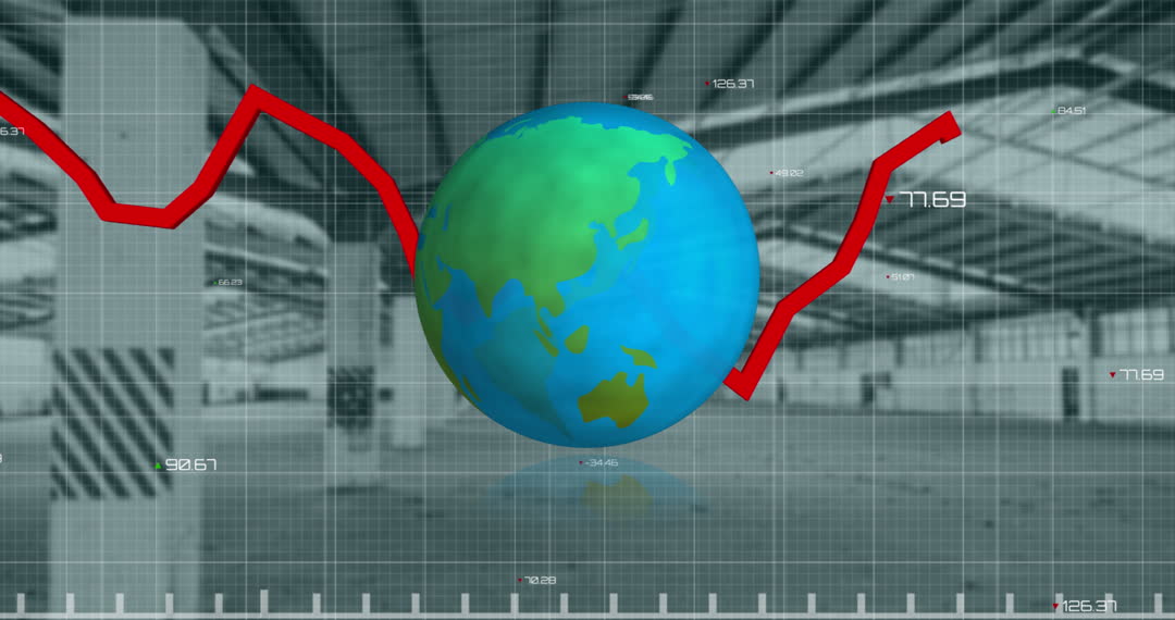 The video shows an animation depicting financial graphs overlaying a globe in an empty warehouse environment, representing global economic and real estate trends. It conveys themes of global finance and market fluctuations, making it ideal for presentation in finance-related articles, investment seminars, or educational materials on international economics.