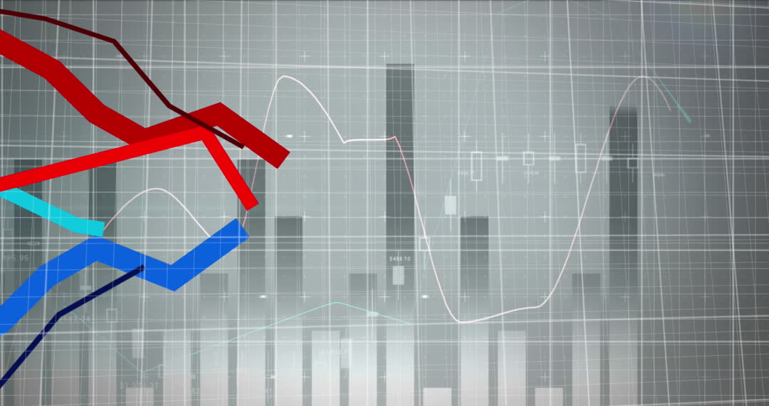 Abstract visualization of economic data with fluctuating graphs in red, blue, and whites. Use for presentations on market analysis, economic trends, business strategies, or financial technology advancements.
