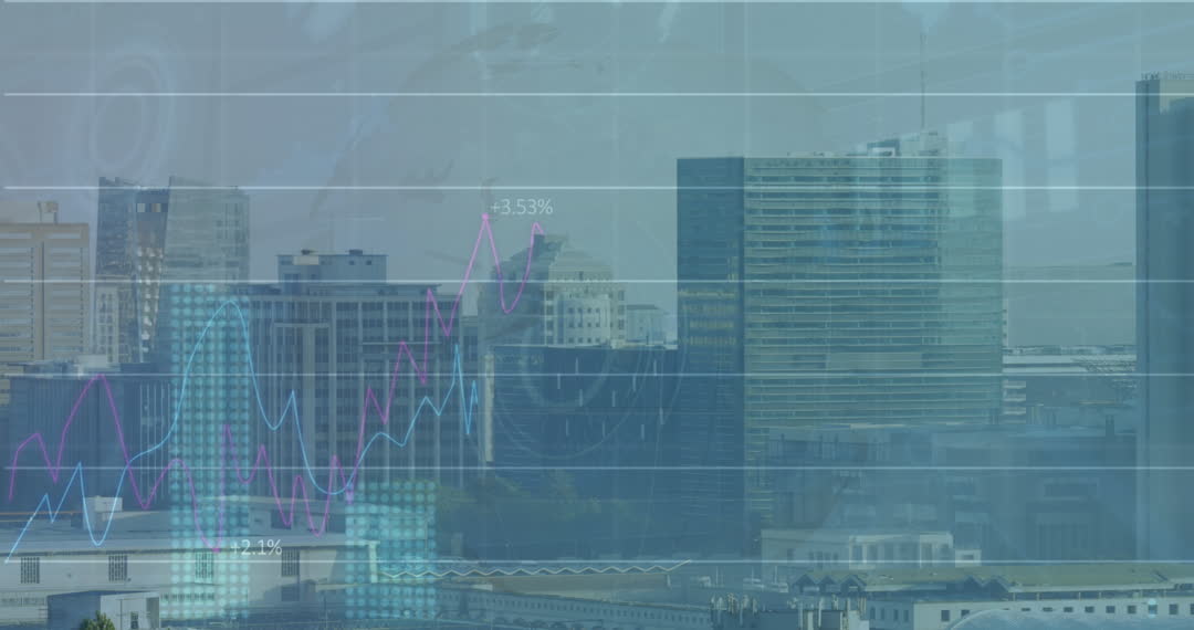Financial graphs and data overlaying a city skyline highlights themes of global finance and economic development. Suitable for presentations or marketing related to business development, financial startups, and investment analytics.