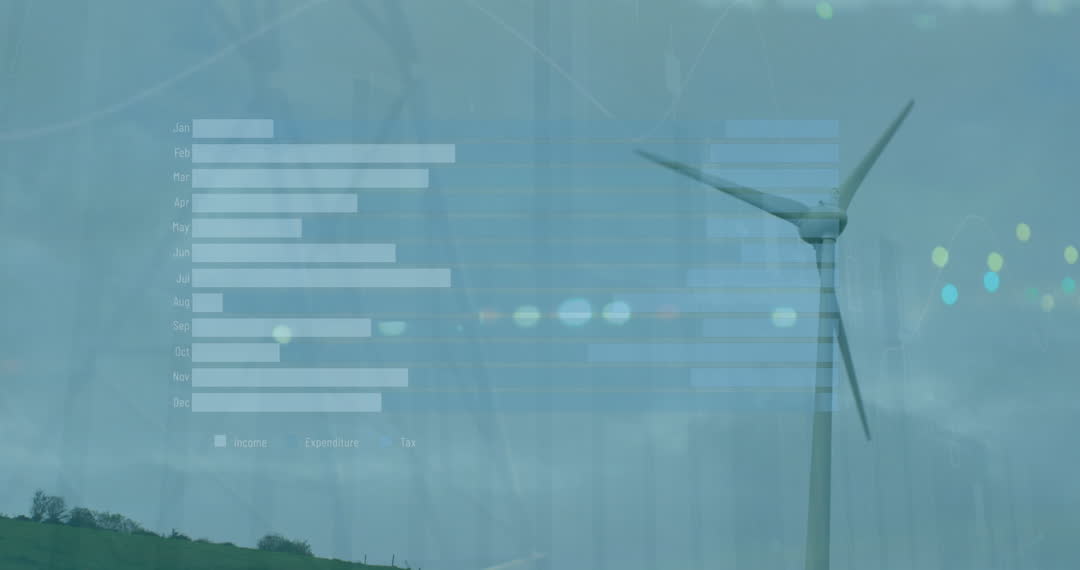 - Financial Graphs Overlapping with Wind Turbine Image Symbolizing Green Energy