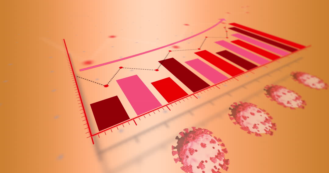 Illustration shows financial data trends aligned with looming virus influences, depicted through a bar and line chart alongside stylized virus cells. Perfect for use in articles and presentations related to global economic impacts, business resilience, and recovery analysis in contexts of health crises.