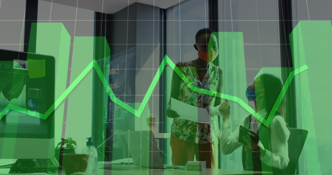 Visual represents integration of financial growth data with real-life business scenarios during COVID-19. Useful for presentations on pandemic impact on economy, business reports revealing diverse teamwork amidst health protocols, or digital illustrations of stock market growth challenges.