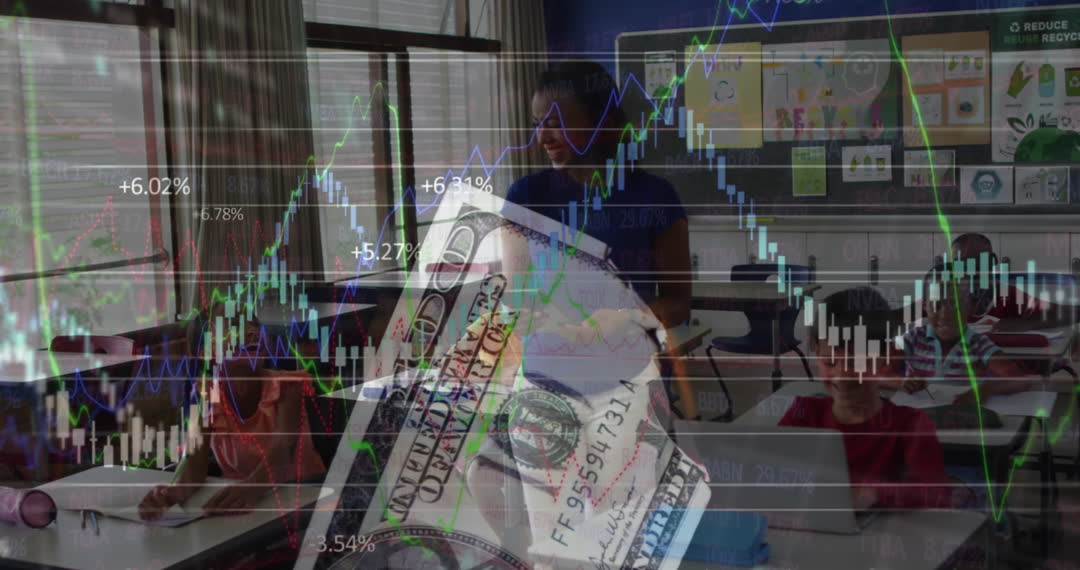 This video combines financial data visuals with a classroom environment, focusing on an African American female teacher guiding students. It represents the intersection of education and finance, perfect for illustrating concepts related to financial literacy in schools, the importance of economic education, or technology's role in classroom settings. Suitable for articles or presentations about integrating finance into educational curricula.
