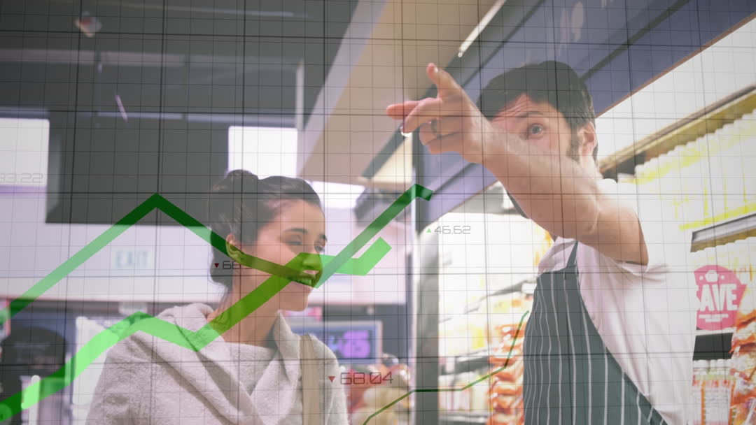 A vibrant overlay of financial graphs on a smiling male seller and female customer in a grocery store, symbolizing economic growth and successful retail operations. Ideal for concepts related to economic analysis, business forecasting, shopping experiences, customer satisfaction, and marketing strategies.
