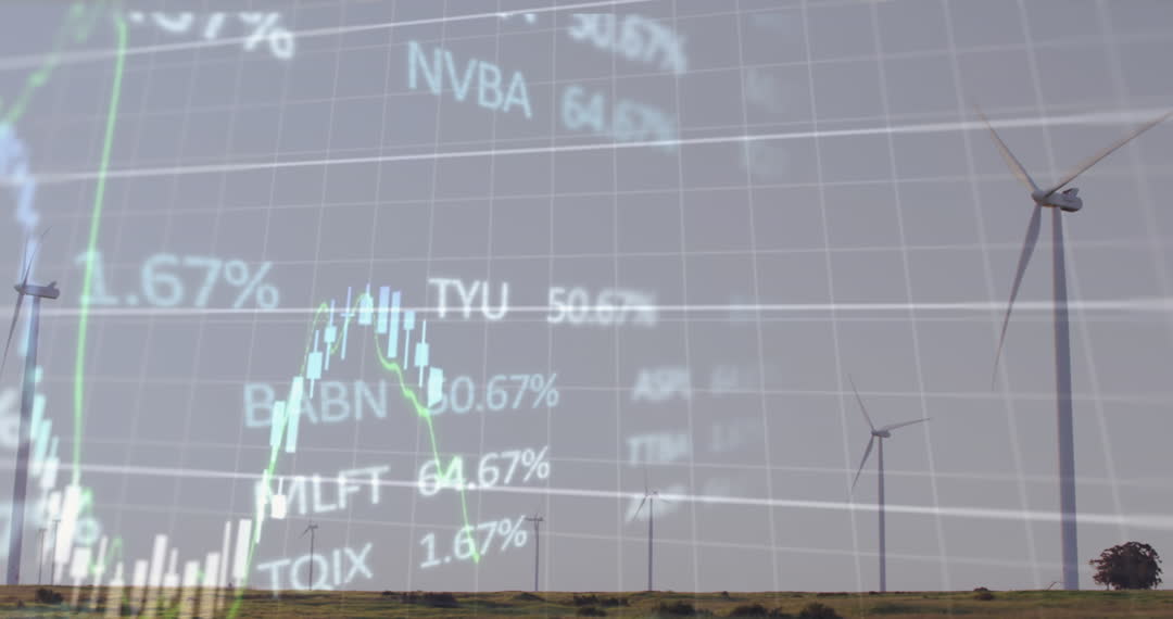 - Financial Market Data Overlay on Wind Turbines Symbolizing Renewable Energy
