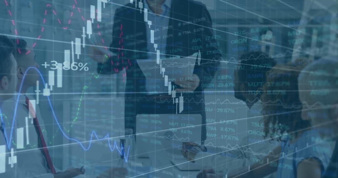 Dynamic scene combining financial data graphics with a business meeting setting suggests accessing thought leadership in finance and collaboration. Ideal for illustrating themes of economic projections, financial teamwork, or corporate strategy sessions. Useful in corporate presentations, investment-related educational materials, or financial service marketing Content.