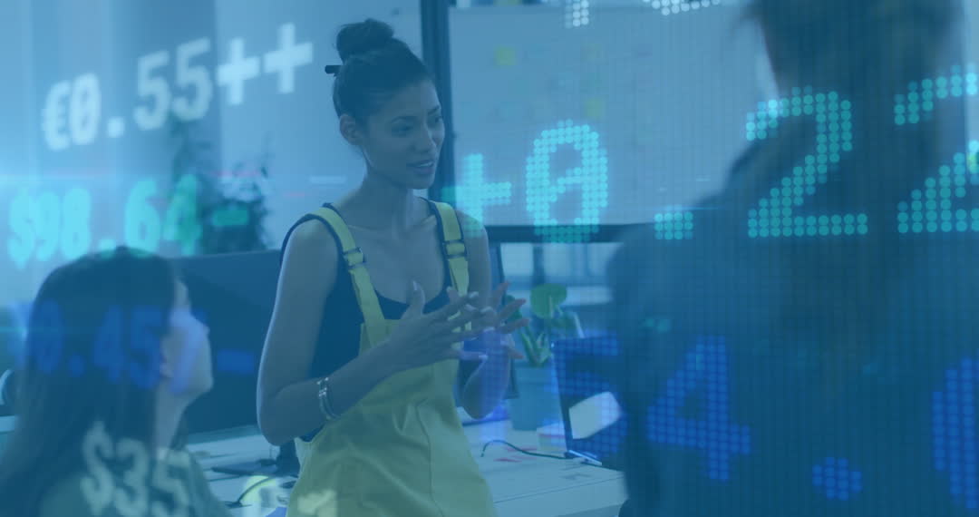 Diverse team in modern office collaboratively discussing under financial data animation overlay. Great for illustrating business meetings, financial projections, corporate strategy, diverse teams, and modern work environments.