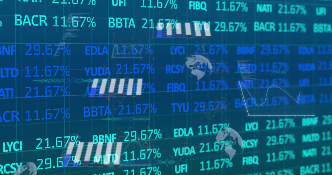 Depiction of fast-paced stock market data, showcasing global finance trends and digital analysis over a grid. Ideal for financial institutions, economic forecasting agencies, and investment platforms aimed at educating viewers or enhancing financial-related content.