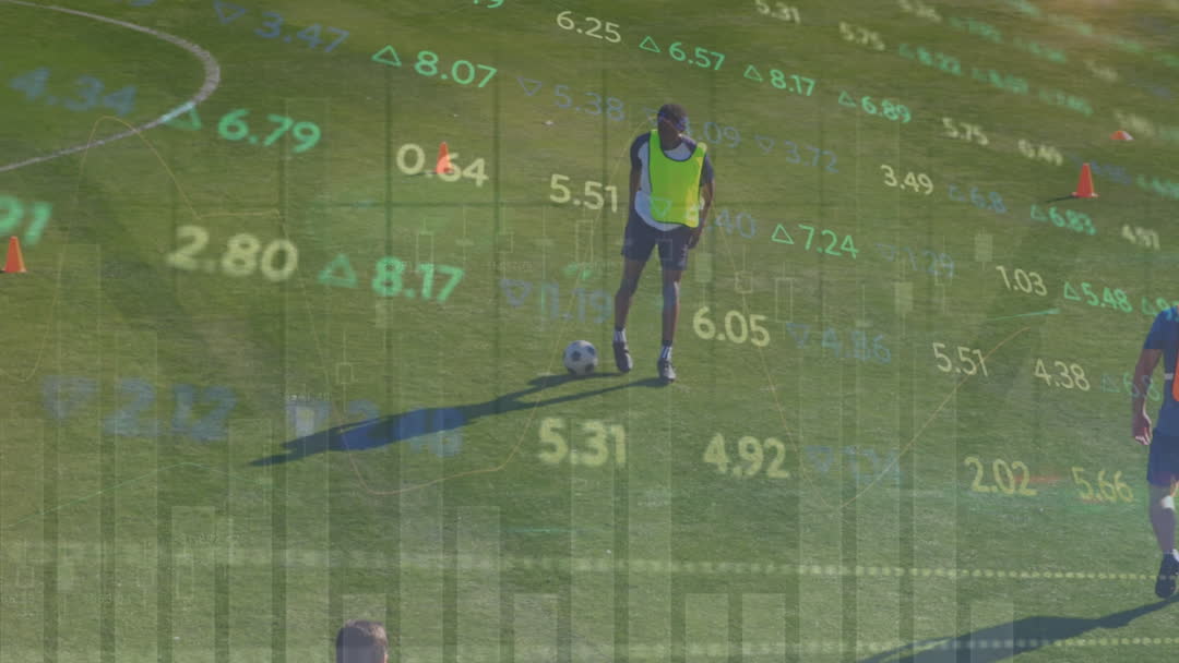 Financial stock data is visually overlaid on a scene featuring male soccer players training on a sports field. This blend of finance and sports videory conveys themes of strategy, performance, and analysis. Ideal for use in content related to the economic aspects of sports, investment in athletics, or strategic business decision-making tutorials.