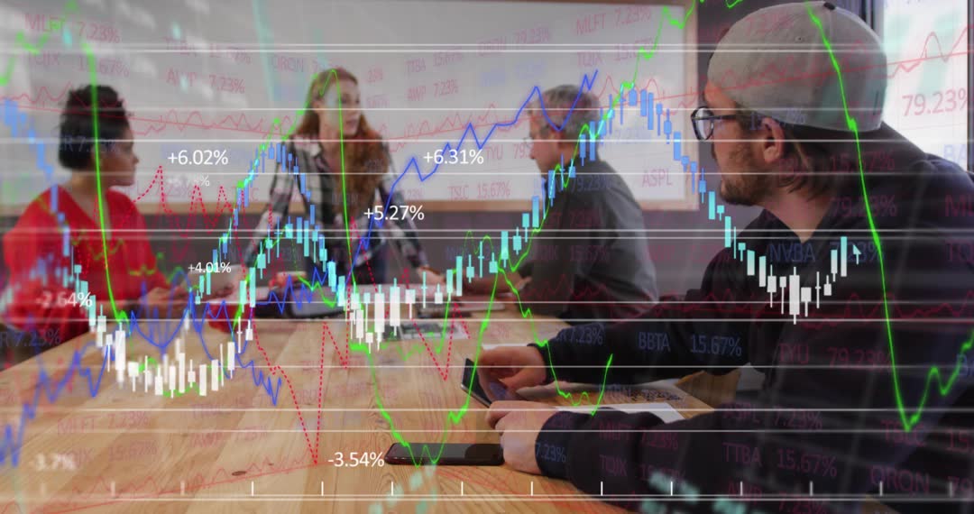 This visual shows a professional team engaged in a financial discussion while animated graphs overlay their meeting space, suggesting they are deeply involved in examining and strategizing around market trends. Ideal for illustrating themes of business strategy, collaborative analytics sessions, and professional office environments focusing on modern finance. Suitable for business proposals, advertising teamwork, or educational content regarding financial strategy and innovation.