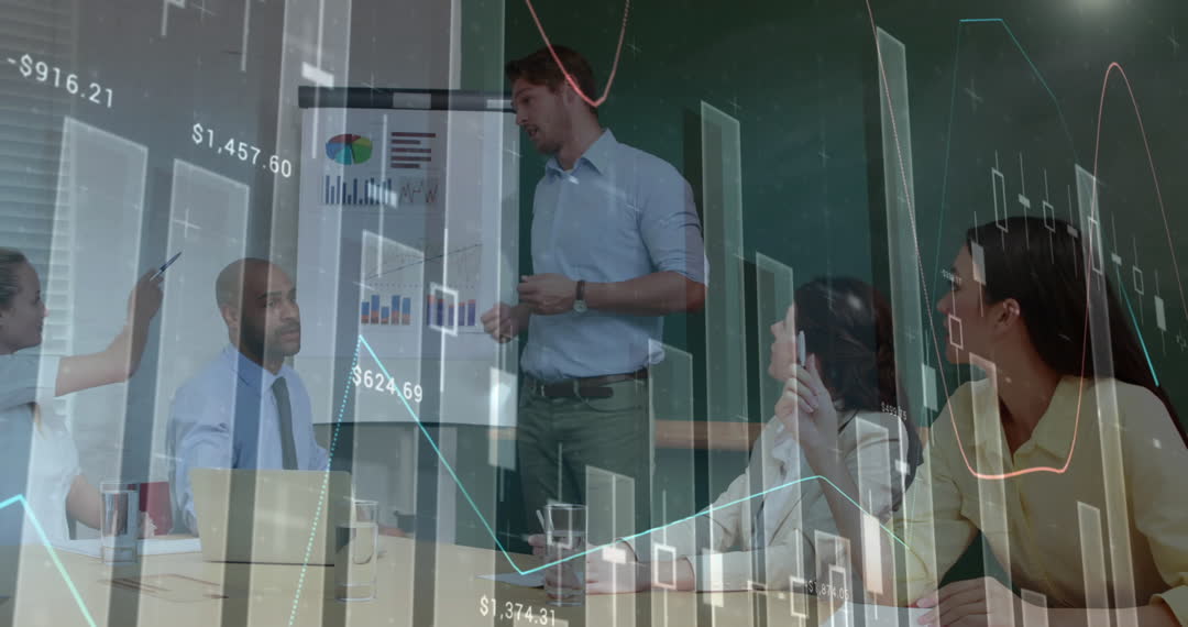 Business team discussing strategy with digital graphic overlays showing financial data and charts. Ideal for illustrating concepts of financial analysis, fintech solutions, corporate planning, and economic forecasting. This video is useful for presentations, reports, and articles about data-driven business strategies and team-oriented finance reviews.