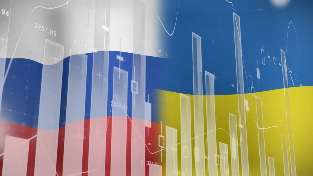 Visual depicts financial market concepts overlaid with Russian and Ukrainian flags, highlighting the geopolitical influence on economy and finance. Suitable for articles, presentations, and educational materials on market trends, geopolitical impact on trading, or investment strategies.