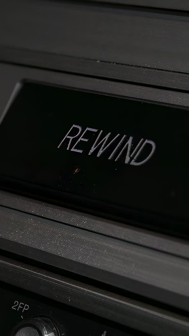 AI Generated Video. Video showing finger pressing REWIND button on vintage cassette deck while tape is rewinding and 2FP transport face is visible. Close-up capturing glossy black control panel, grooved metal rotary and tactile knob with shallow depth of field and subtle dust particles adding authentic retro character. Vertical orientation optimized for mobile reels and stories, offering strong focal action for quick cuts or slow-motion playback. Usage ideas: use as B-roll for documentary or music history segment, include in social media reels and Instagram stories for retro music or nostalgia themes, add to tutorial or repair video about cassette decks, feature in product demo for analog audio equipment, use as background clip for podcast or album promotion targeting lo-fi or vintage audiences. Editing tips: apply slow motion or speed ramp on rewind action, layer with mechanical tape motor audio and reel hiss for atmosphere, crop-safe for 9:16 delivery and suitable for vertical ad placements.