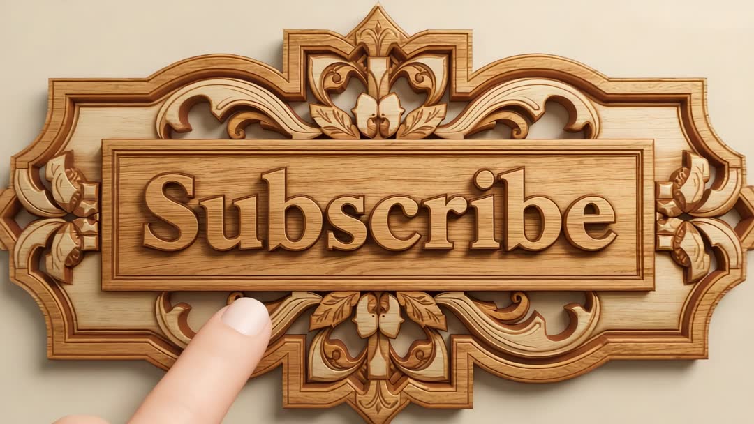 AI Generated Image. Showing ornate carved wooden panel with raised Subscribe lettering and floral relief motifs. Right index fingertip entering from lower-left and sliding across plaque, suggesting pressing subscribe button. Warm beige background and rich oak grain creating premium handcrafted look. Lighting highlighting depth of carving and shadow detail. Ideal for social media end screens, video outros, channel intros, membership promos, tutorial call-to-action overlays, website banners, email campaign headers. Useful for YouTube creators, content marketers, digital publishers, craft or woodworking channels. Editing suggestions: adding subtle click animation, overlaying branding logo, applying animated text and subscribe counter. Color grading options: warm vintage, high-contrast, muted tones. File usage: suitable for video thumbnails, motion graphics projects, promotional ads, presentation slides.