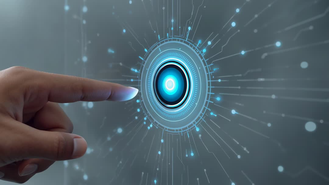 AI Generated Image. Video showing adult index finger touching holographic circular interface, activating glowing blue core and radiating digital circuits. Scene presenting close-up interaction with touchscreen-style HUD and data pulses, ideal for technology and AI storytelling. Footage working well for website hero banners, explainer videos, product demos, app intros, corporate presentations, training modules, and marketing campaigns focused on innovation and digital transformation. Composition offering clear space for overlay text and logo placement, color palette emphasizing neon blue and gray for modern tech branding.