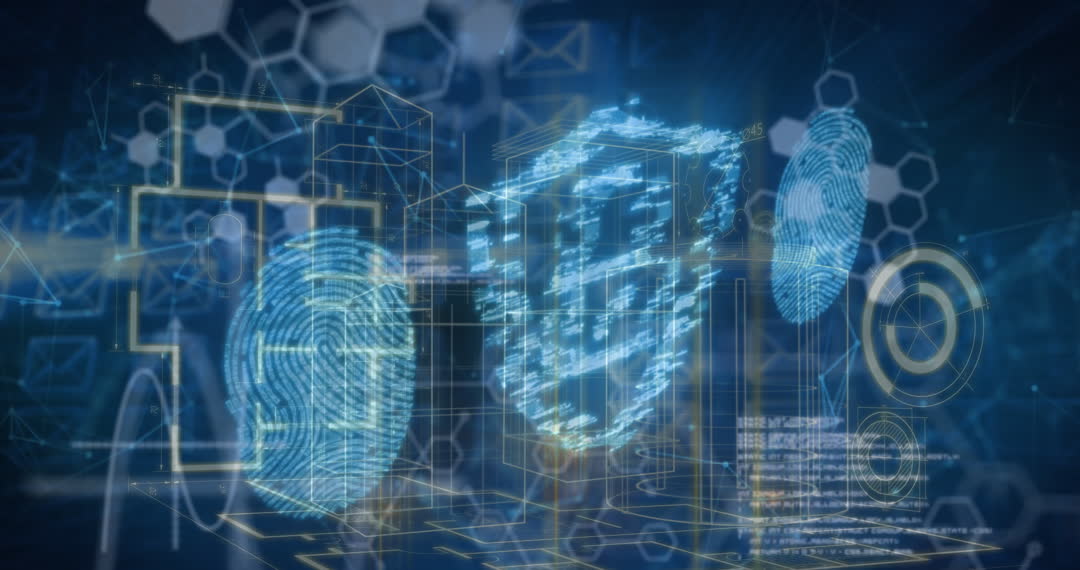 This visual concept displays a digital interface focused on cybersecurity, showcasing digital padlock and biometric fingerprints. It captures the technological theme and possibilities in securing data using advanced methods. Useful for illustrating ransomware protection, cybersecurity measures, network security systems, and biometric technology explanations. Ideal for use in tech-related publications, websites discussing digital security advancements, or presentation slides addressing information technology solutions.