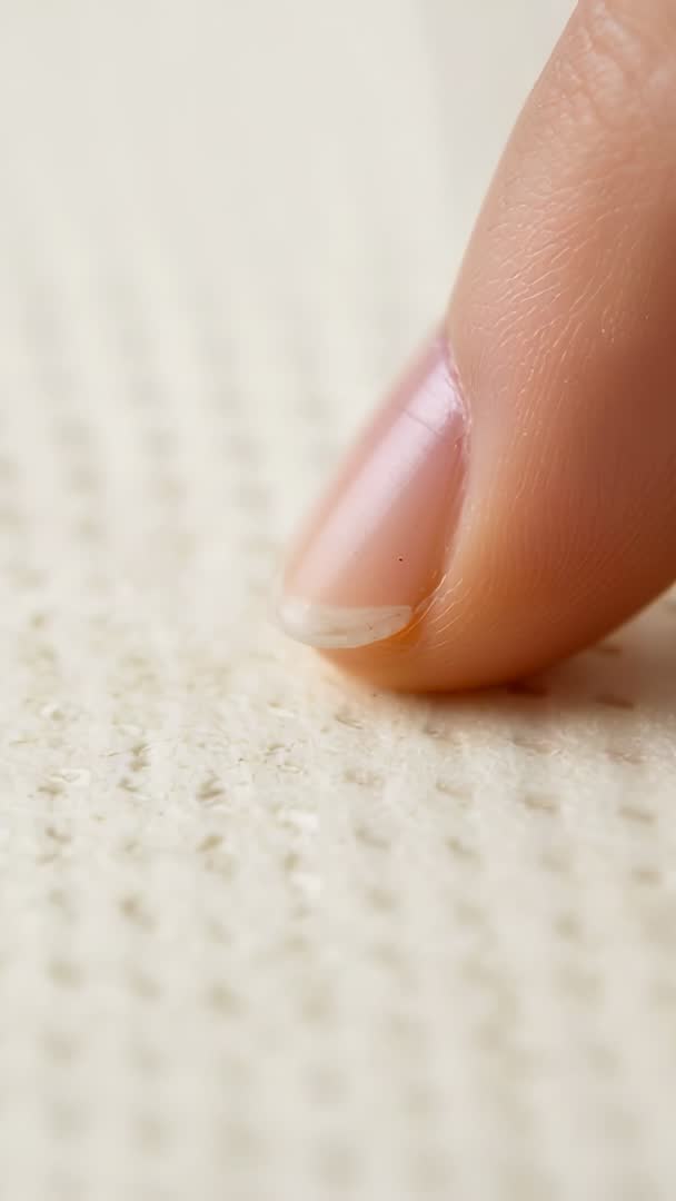 AI Generated Image. Vertical macro video showing fingertip pressing and gliding across cream woven fabric, testing texture and softness. Suited for textile and mattress brands, ecommerce product listings, quality control demonstrations, tutorials, sensory marketing and ASMR content. Serving as B-roll for product pages, ad banners, mobile vertical ads and instructional videos. Offering ample copy space on left side for overlay text, logo or call-to-action. Highlighting weave detail and hand interaction for promotional, editorial or educational use.