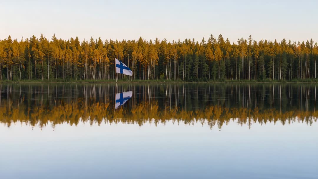 AI Generated Image. Finnish flag fluttering along tranquil shoreline, reflecting clearly in glassy lake while warm sunlight glowing on tall pine trees. Horizontal composition creating strong symmetry and minimalist mood, with mirror reflection doubling forest silhouette. Offering versatile clip for travel promotion, national day campaigns, tourism marketing, cultural documentaries, social media reels, website hero backgrounds, corporate branding for Finnish companies. Working well for nature editorials, environmental awareness pieces, meditation or relaxation video loops, broadcast openers, presentation backgrounds. Providing options for color grading, slow motion, loopable edit to enhance mood and pacing in online or broadcast projects.