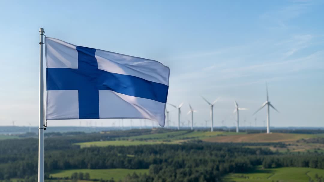 - Finnish flag fluttering over wind farm with wind turbines spinning across countryside
