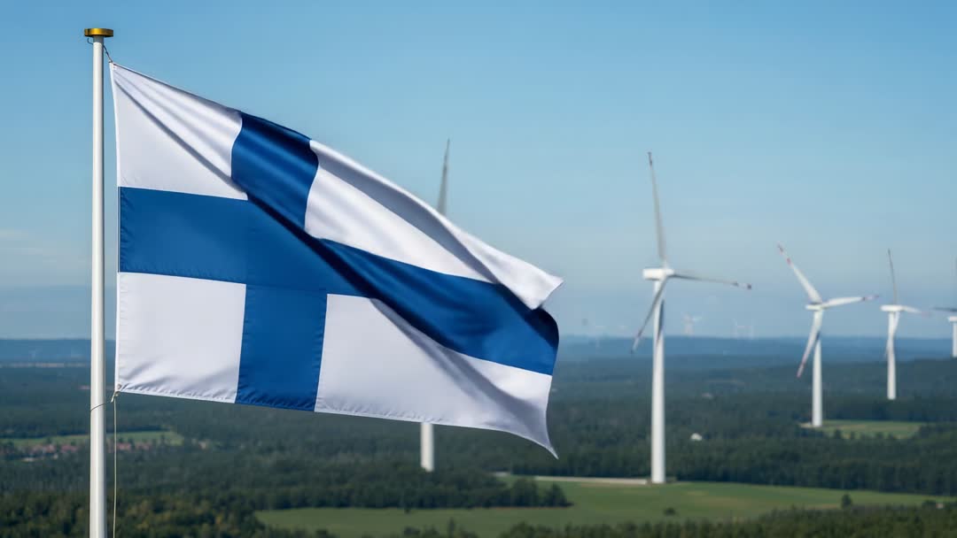 - Finnish Flag Waving Over Coastal Wind Farm During Clear Day Renewable Energy Scene