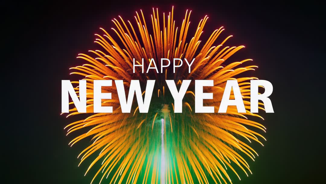 - Fireworks bursting into orange-green chrysanthemum with Happy New Year text overlay