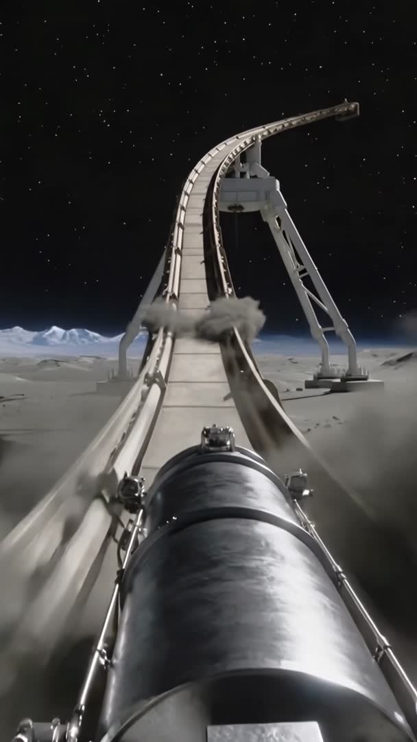 AI Generated Image. Video showing first-person view of metallic capsule rolling along elevated rail across lunar regolith toward curved launch ramp under star-filled sky. Dust kicking up from track, carriage and support structure rising from cratered plain, distant mountain ridges framing horizon. Camera perspective closely trailing capsule body, emphasizing speed, momentum, and mechanical detail. Usage ideas: Use for sci-fi trailers, space tourism promotion, technology or engineering presentations, VR ride previews, theme park attraction teasers, educational content about lunar transport concepts, social media vertical reels and mobile-first advertising. Work well as dramatic opener, background for title text, or looping action clip for immersive displays. Editing tips: Keep vertical 9:16 orientation intact for mobile consumption. Add cinematic low-frequency soundtrack, whoosh and rumble SFX, slow-motion segments for detail shots, and color grade toward cool desaturated tones for high-tech feel. Create seamless loop by matching dust motion and capsule position at clip ends. Mood and tone: Evoking suspenseful, futuristic, adventurous atmosphere with stark lunar landscape, high-contrast metal surfaces, and starry black sky.