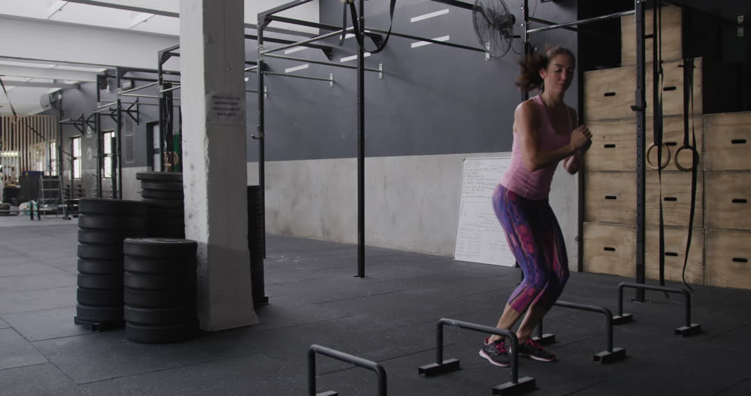 - Fit Caucasian Woman Cross Training with Hurdles in Gym