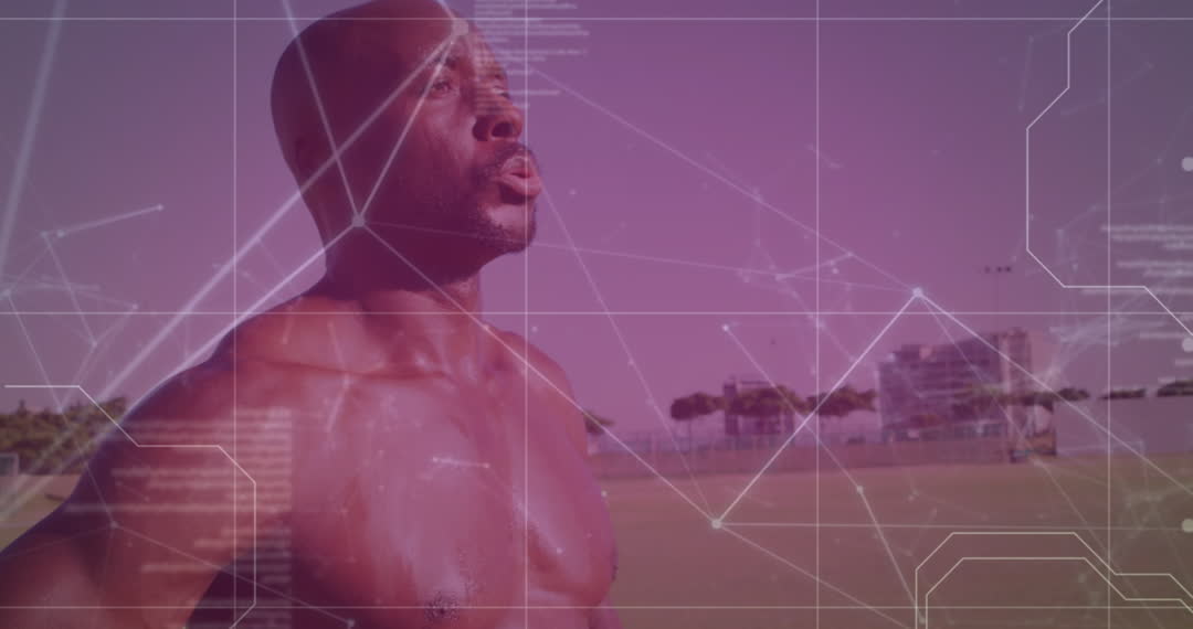 This vibrant visual illustrates a fit African American man pausing during an outdoor workout, enhanced with digital connection overlays suggestive of technology or virtual reality integration. Ideal for use in promotional materials, emphasizing the intersection of fitness and modern technology. Suitable for articles or content focused on wellness apps, fitness tech advancements, or sports science studies.