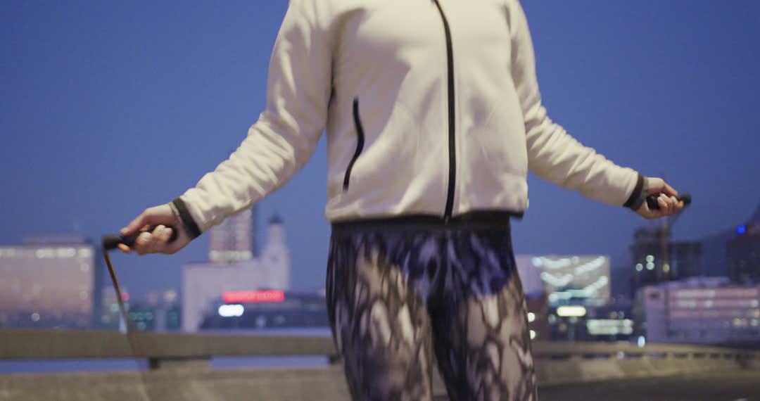 This video depicts a fit Caucasian woman engaging in a night-time workout by skipping rope amidst a city backdrop. The focus on her athletic attire and activity makes it ideal for websites and promotional materials related to fitness, exercise routines, urban lifestyle, or sports apparel. It can be used to inspire an active lifestyle or as an illustrative visual for sports-related articles and blogs.