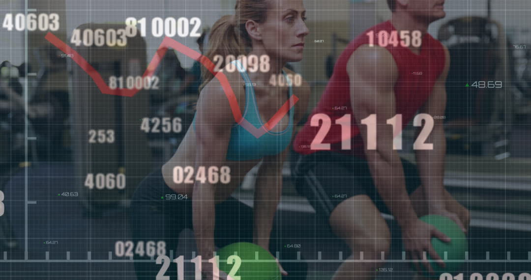 This vibrant depiction of a couple exercising in a gym with an overlay of data analysis and statistics symbolizes the integration of technology into fitness and health monitoring. Ideal for use in content related to fitness technology, analytics in sports science, or digital fitness platforms. The blend of gym activity with high-tech elements represents modern developments in lifestyle tracking, appealing to fitness enthusiasts and tech innovators alike.