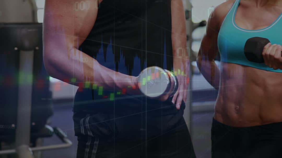 Video showing fitness couple syncing dumbbell curls with candlestick chart overlay tracking strength gains and progress. Foreground focusing on muscular arms and core while gym equipment remaining soft-focused. Dual concept blending fitness training with financial data visualization for metaphorical storytelling. Ideal for fitness brand ads, gym or trainer promotions, corporate wellness campaigns, fitness finance articles, and social media reels. Use for headlines about performance tracking, investment in health, progress dashboards, app interfaces, and motivational or lifestyle content highlighting measurable results.