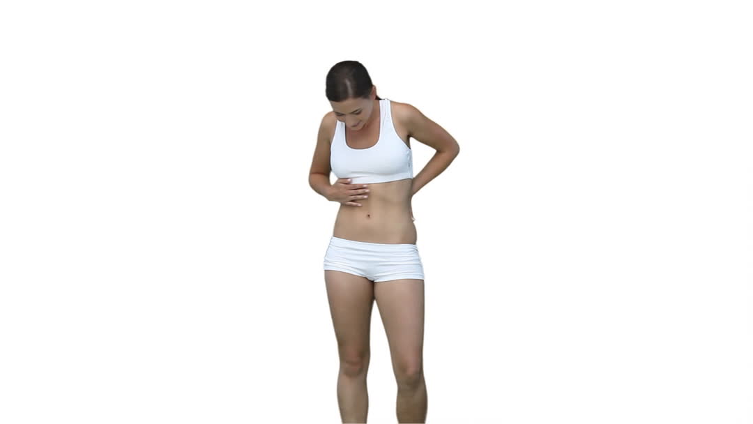 A fitness enthusiast in athletic wear is looking at her body to assess fitness progress. With a simple and clean white background, the focus stays on body positivity and health check-ins. Ideal for use in fitness campaigns, healthy lifestyle promotions, and wellness blogs.