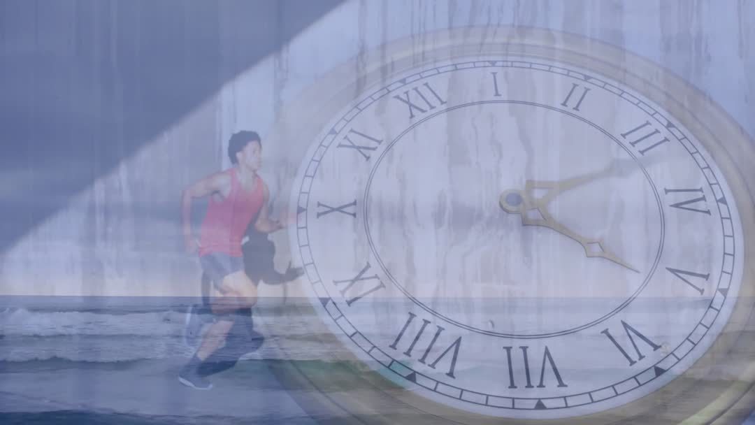 Fitness Enthusiast Running on Beach with Ominous Clock Overlay Video