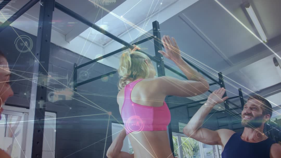 Video captures vibrant scene in a gym as a woman actively performs pull-ups on a bar surrounded by advanced fitness data graphics. Partners cheer her on with high-fives, symbolizing camaraderie and motivation. Scene embodies collective dedication towards physical fitness. Perfect for use in marketing gym technology, motivational workout sequences, or teamwork in sports videos.