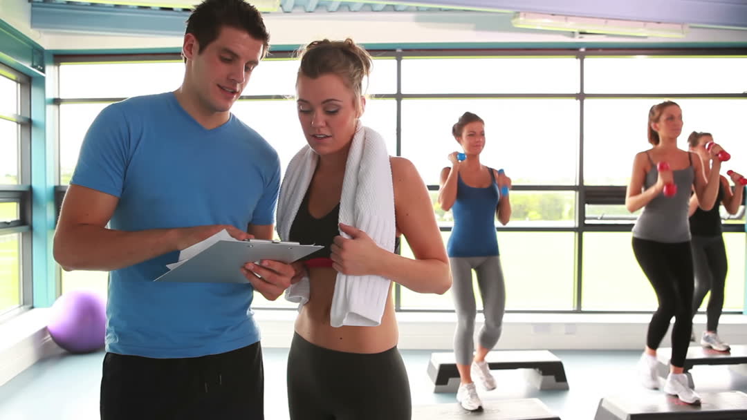 A fitness instructor is providing guidance to a woman during an aerobics class in a gym. They are reviewing details on a clipboard, displaying dedication and focus in the workout session. Other participants are seen exercising with weights and steps in the background. This visual is ideal for fitness and wellness promotions, health awareness articles, or publications related to gym training tips.