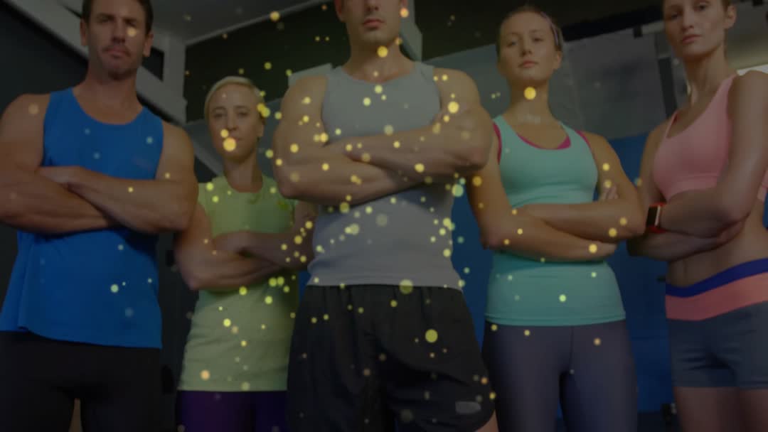 Group of confident fitness enthusiasts standing with arms crossed, radiating motivation and teamwork qualities. Dynamic gold particles floating adds a vibrant energy to the scene. Suitable for themes showcasing teamwork, motivation, contemporary fitness, health, and vitality. Ideal for advertising, blogs, and fitness campaigns highlighting group training efforts.