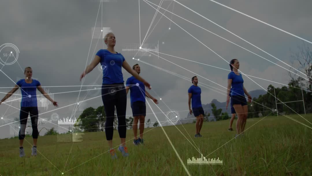Individuals are outdoors participating in exercise with an emphasis on monitoring physical performance through technology. Biometric indicators overlay video illustrating use of technology in fitness tracking. Great for illustrating modern fitness solutions, team exercises, and technological advancements in health monitoring.