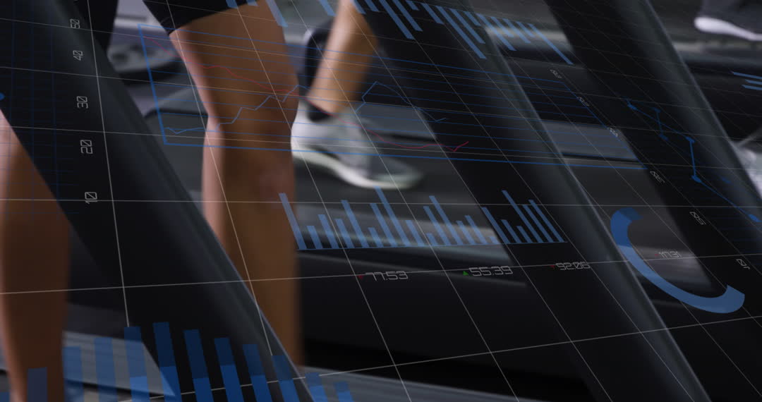 Treadmills with a transparent overlay of digitalized data graphs and percentage charts convey the intersection of fitness and modern technology. Useful for promoting smart technology gym equipment and fitness apps focused on data-driven health solutions.