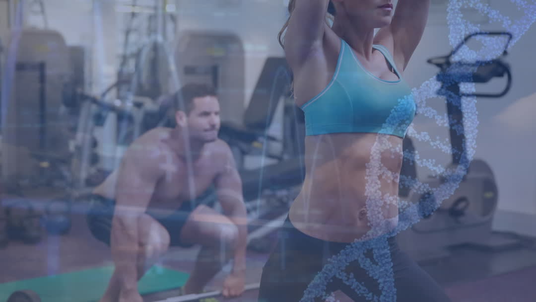 Shows a couple exercising in gym, emphasizing genetic and data-processing. Useful for fitness clubs, health blogs focusing on personalized training, advertisements incorporating sports technology in lifestyle.