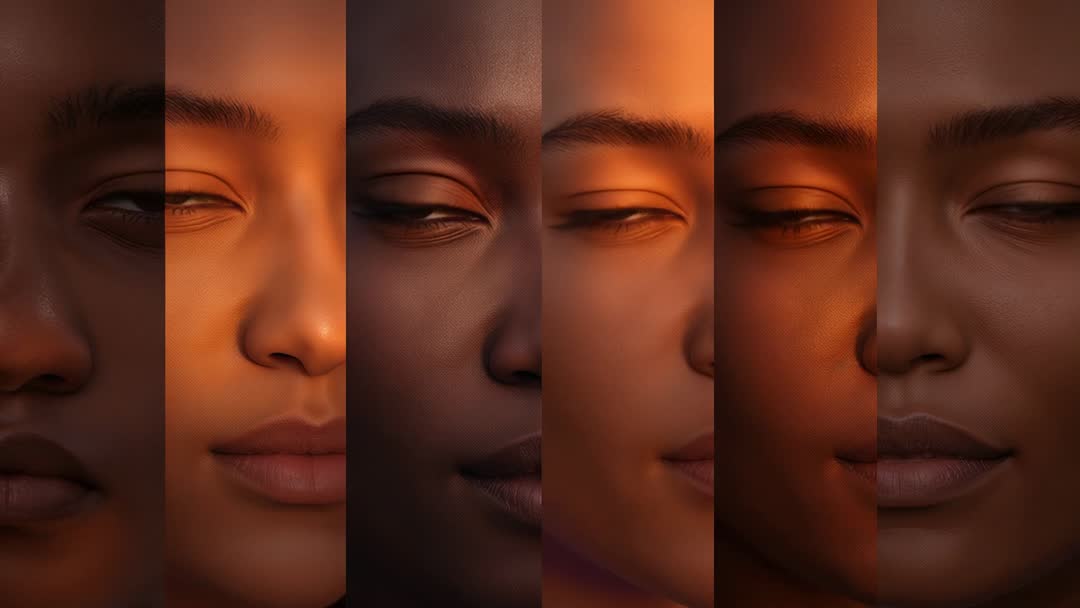 AI Generated Image. Showing five vertical portrait panels of female faces with slow, subtle eye movements. Featuring warm key light sweeping across varied skin tones and soft shadow detail. Panels are closely framed on eyes, nose and lips, creating intimate, meditative mood. Footage is loopable for ambient backgrounds and works well at slow playback for cinematic effect. Ideal for beauty and skincare campaigns, wellness and meditation videos, fashion editorials, social media posts, website hero backgrounds, commercial bumpers and title sequences. Suggest using gentle color grading, soft vignette and optional ambient music to enhance calm mood. Provide as background for product overlays, quote cards, app intros, or multimedia presentations. Include model release when licensing for commercial use. AI-generated attribution can be added if required by platform.